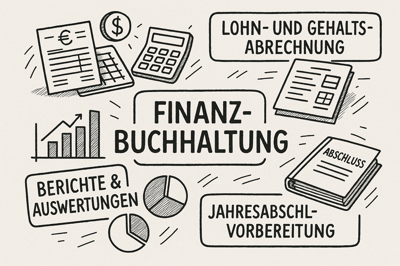 Wir übernehmen für Sie Finanzbuchhaltung, Lohn- und Gehaltsabrechnung, Jahresabschluss-Vorbereitung sowie aussagekräftige Berichte & Auswertungen.